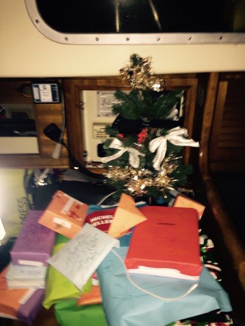 Natalia began fixing dinner late afternoon; an Iranian recipe for chicken with rice, that included almonds and cloves. ln land, in Ecuador, we have a tradition of roasted turkey or pork and I was worried about breaking it, given that the oven in Antares is not operational. But nobody seemed to mind. The girls were in charge of the decoration of the boat. We had a small christmas tree that I brought from DC. It was installed over the navigation table surrounded by small presents, many designed on site by Marina and Sofia. For lights we used head-lamps.