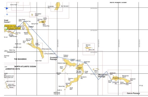 In terms of the crossing itself, I have been thinking about the best way to do it. Most likely the winds will be blowing from the East, a few degrees north or south. Beating to Turks and Caicos is not very appealing, particularly with wind speeds above 15 knots, which are common during the winter. Because I have to be back to DC on the 21st to take a plane to Ecuador the next day, I cannot be waiting for a weather window; in this case a mild front that would carry me from say Rum Cay to Mayaguana on a reach. I’ll have to manage with whatever wind we get, short of a gale ir storm. I was reading Bruce Van Sant’s Passages South. He recommends to go from the North of Long Island to Crooked Islands and transit their north cost at night (assuming there is a night breeze that neutralizes the trade winds). From there go south of Plana Cays, eventually tack and anchor in Mayaguana for a 50-60 miles passage to Turks and Caicos the next day (see chart). Will have to see and will keep you updated.
