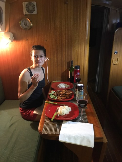 On Monday we left at high tide. It was mid afternoon so we anchored not far from the entrance to the marina; the same spot were I had anchored with Richard back in December. The french couple in their red, steel, boat joined us one hour later. They swam to Antares bringing a bottle of white wine that they asked we put on the fridge. They were supposed to come for dinner later that night but it didn’t happen. Family affairs. Instead, soon after sunset, Natalia spotted their dingy drifting away towards the beach. We quickly grabbed our head lamps and boarded Harper. We motored towards the dingy, captured the fugitive, and brought it back to its owners. Antoine was there at the stern of his boat wondering how it had happened, how was the dingy able to scape? Back in Antares we cooked dinner for just the two of us while zipping red wine. We ate in the cockpit under planets, black holes and stars. After a movie about a world controlled by vampires who are running out of human blood and need to invent a substitute (at least for the masses who can’t afford the real thing), we went to bed.