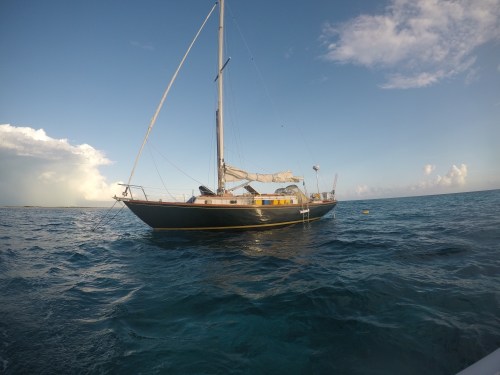 Wednesday I flew the drone over the cay and got some great footage; the Atlantic to the south the banks to the north. Birds flying undisturbed by the foreign object that was filming them, others hatching their eggs, waiting for food. Antares at anchor along side a new boat that had come. The sun falling in the west. Unfortunately, on Thursday, in the second take-off from Antares’ bow, the drone landed in the water. It all happened in seconds. All my fault, my lack of experience. The drone touched the life line, lost control, fell and then sank. I grabbed my snorkeling mask and jumped to the rescue. I found the drone resting at the bottom, as if ready to take-off. I brought it back to the surface and handed it to Natalia who started drying it, but it was too late. Not only the drone was gone but also the footage. I hadn’t downloaded the videos/pictures from the previous day and the sim card was fried. I new that the right way to launch a drone from a boat is to hold it in your hands outside the rigging and then send the take-off command. Not sure why I didn’t do it that way. The poor drone had a short life, a good portion of which was spent in captivity in Georgetown. A sad story.