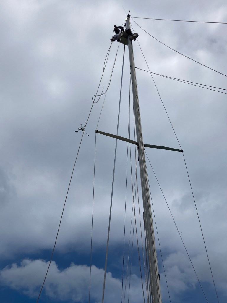 The mast was installed only yesterday and it was stressful to watch. The windex broke off and after the mast was in place a guy had to be winched up to replace it. Then came the rigger to tighten the various wires. Antares is looking good with her rigging in place. The dingy, which had gone to a repair shop on Thursday because it was losing air, also came back yesterday.
