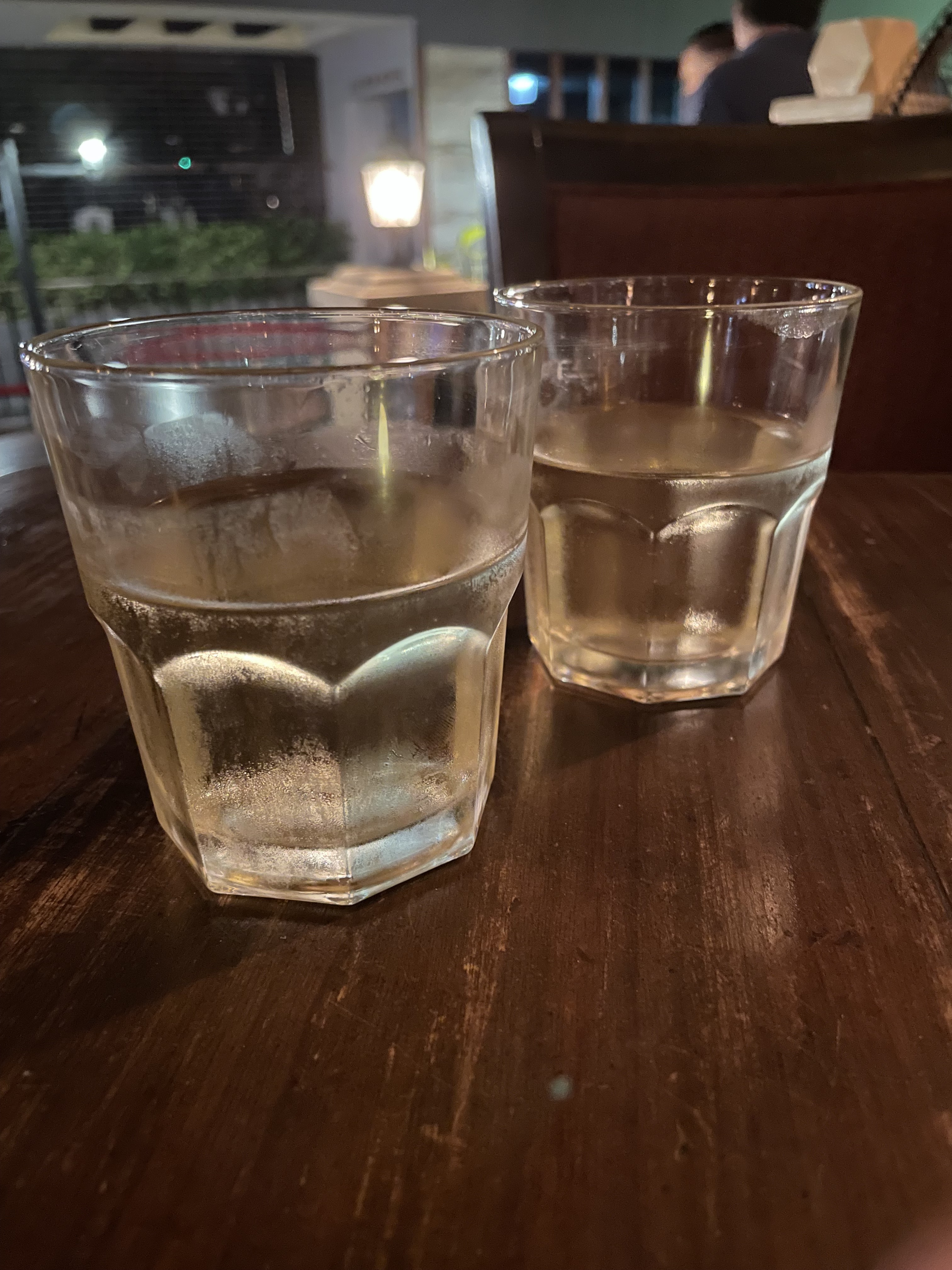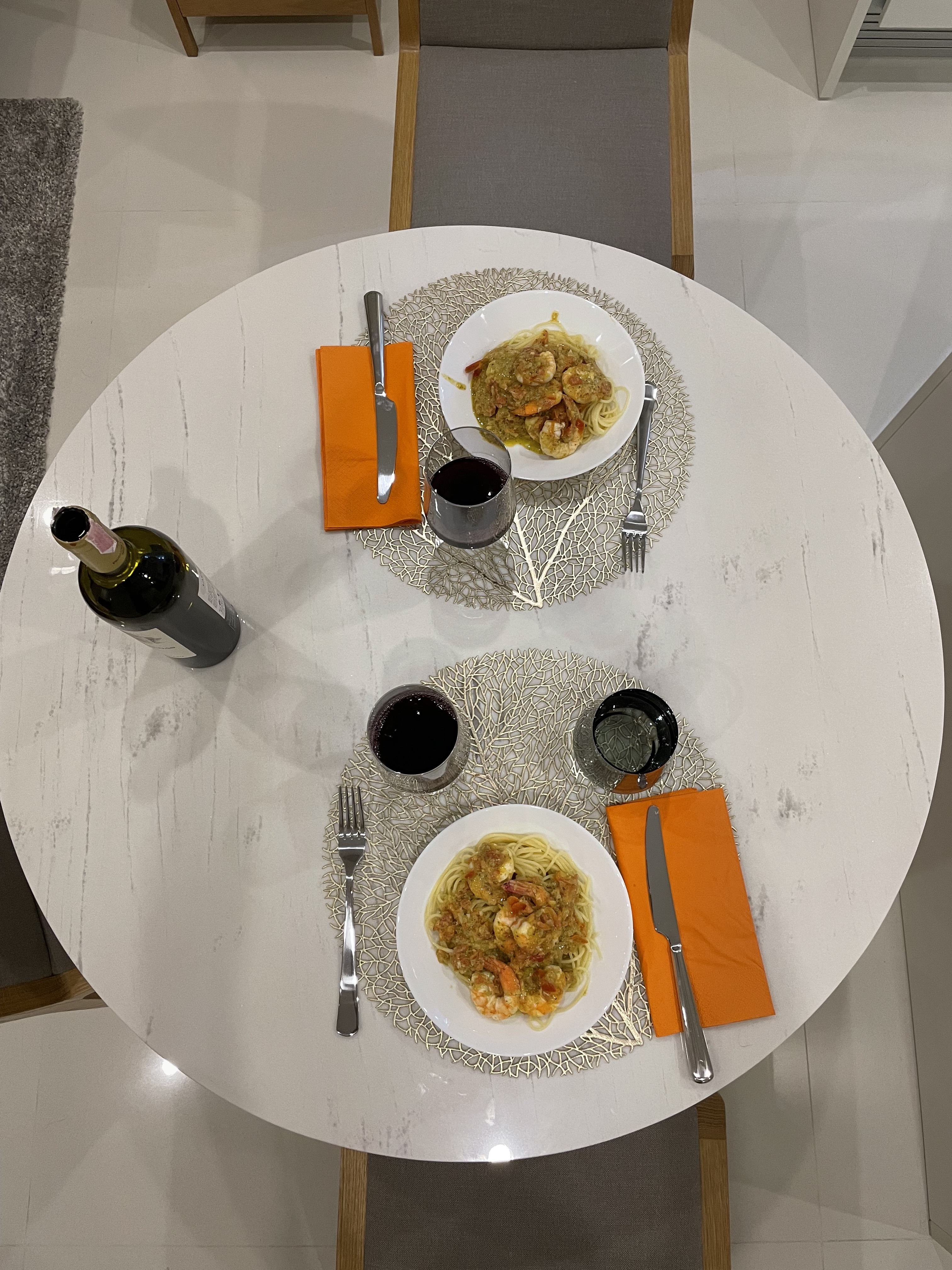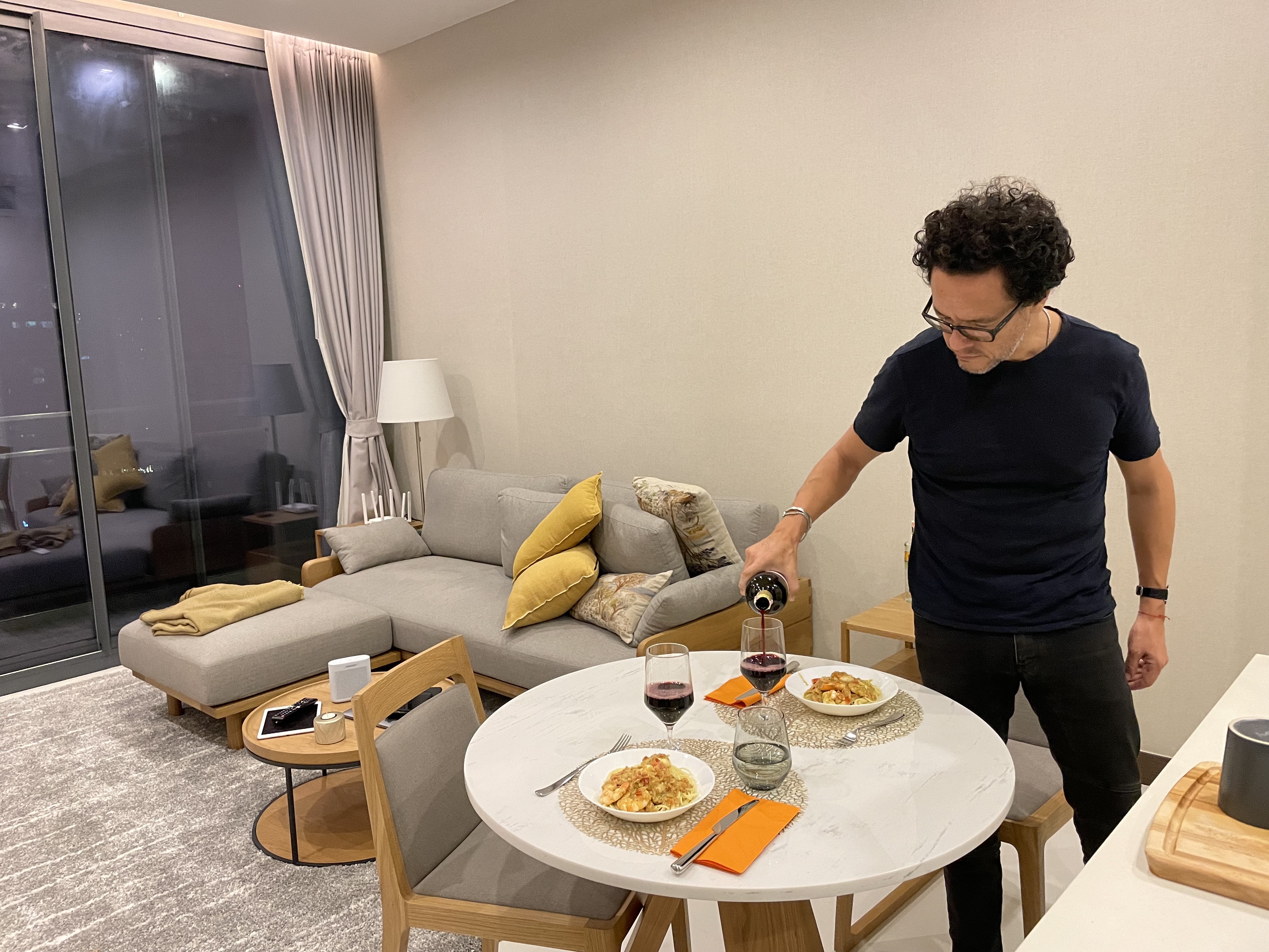 I like the neighborhood where we are, Khlong Toei Nuea. There are several cafes and restaurants close-by and an station for the BTS (the train) is just a few meters away. The restaurants are not supposed to serve alcohol these days, but we discovered that around here they do; they just don’t use wine glasses (the two glasses in the picture contain Sauvignon Blanc). Yesterday though we preferred to stay home and had red wine in proper wine glasses; I cooked for the first time in weeks.