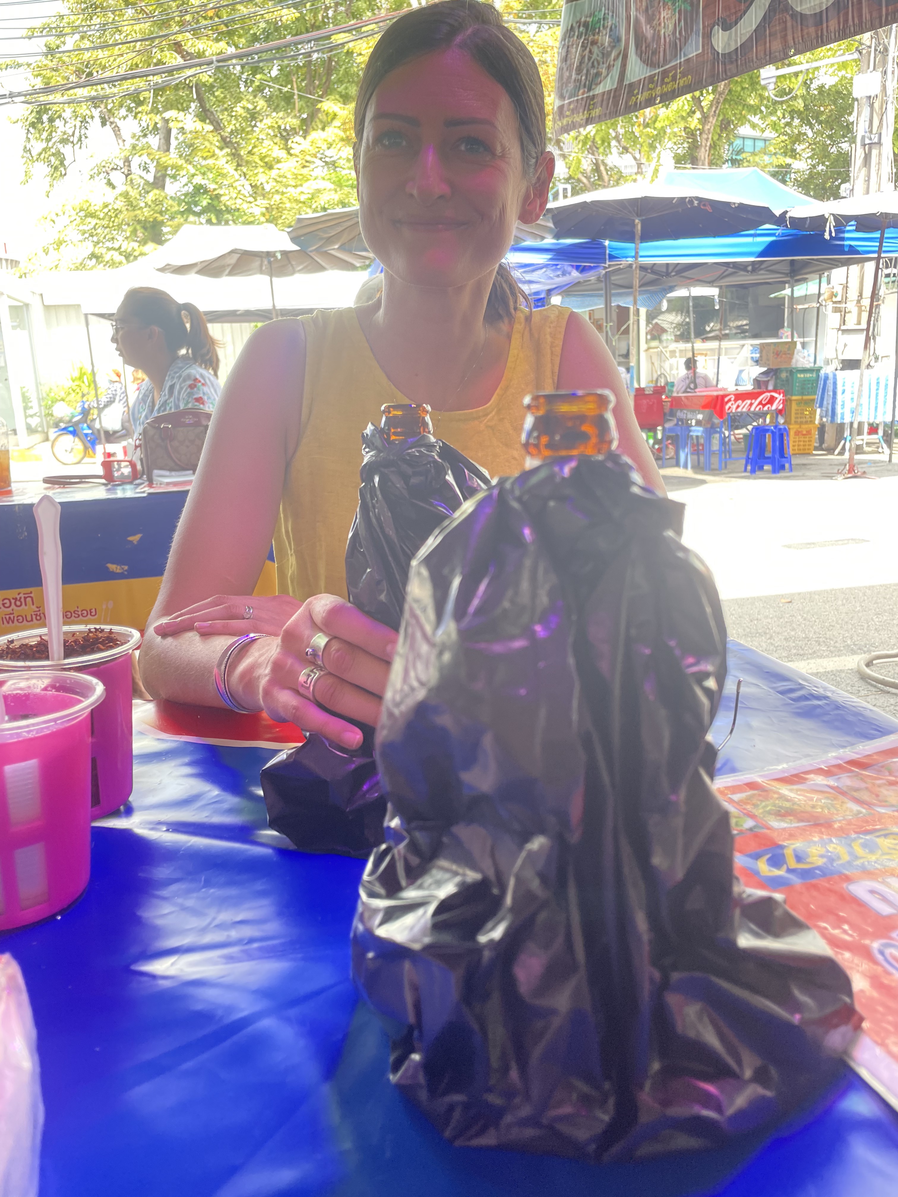 This is is an addendum to the post this morning. We went to a “weekend market” some 10 BTS stations from here. You can find anything you want there, from plants to animals, jewelry, clothes, shoes, handcrafts, pots and pans, dishes and silverware. I bought a leather bag — for less than USD 100 — that I plan to use as a complement to my carry-on when I go to the boat (see pic). Just enough for some clothes and Antares’ electronics. We also enjoyed some street food and a cold local beer hidden in a plastic bag. When we came back it was +30 C and humid. As planned, we went to the pool. Now we have torrential rain outside and I am about to poor myself a gin and tonic. Our plans to go out for dinner (Japanese) might have to be cancelled.