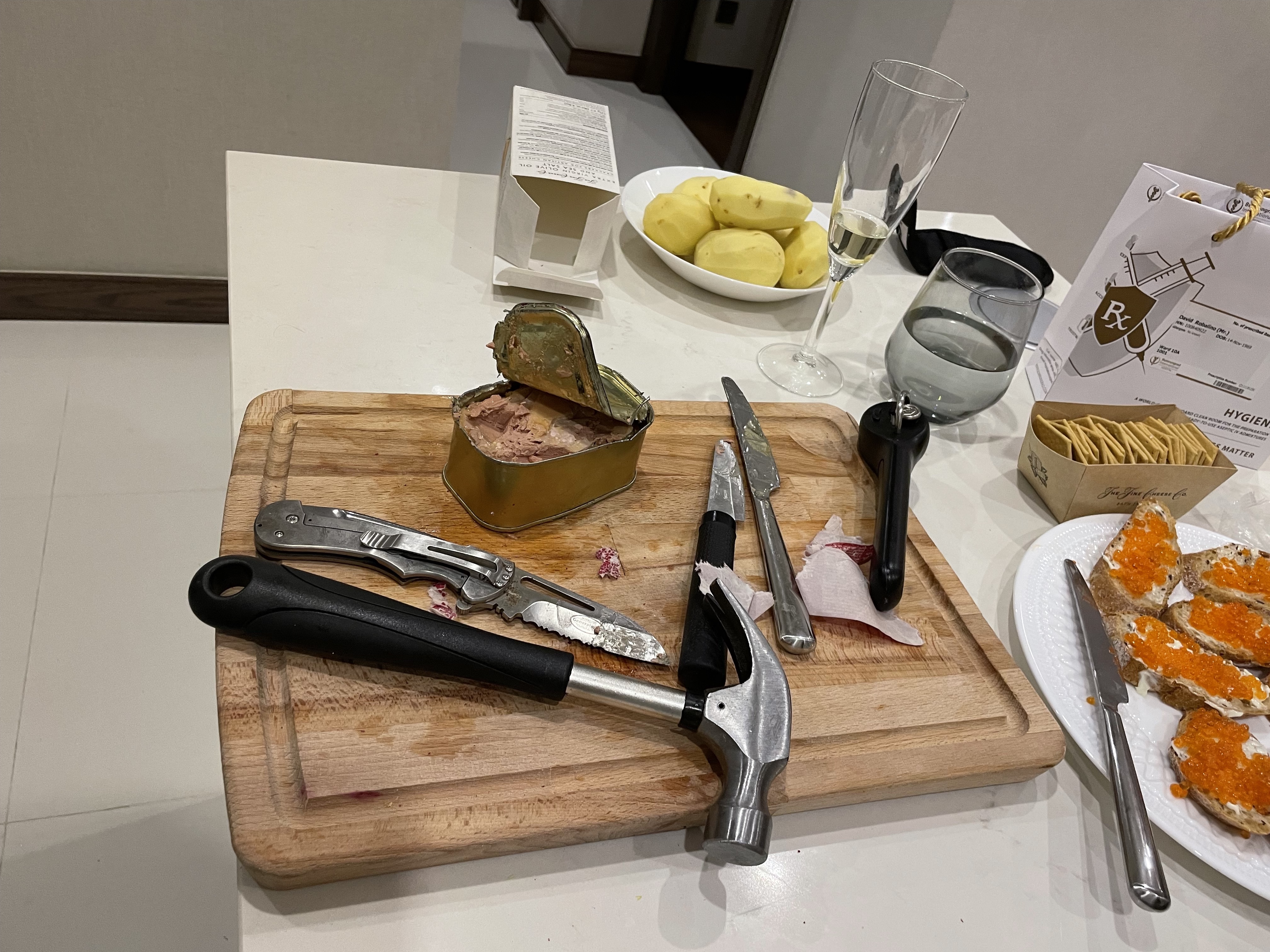 Natalia and I had a pleasant Thanksgiving. Because of my hand, she was in charge of the cooking. And because it was only the two of us we changed the main dish: duck confit instead of a turkey. But following our tradition we had foie gras served with Sauterne, red caviar from Latvia, and plenty of cava and red wine. We did have major problems though opening the can of foie gras. We are staying in a temporary, furnished, apartment and don’t have all the essentials. I got us a can opener at a store close-by but it was not up to the task so we had to improvise (see pic).