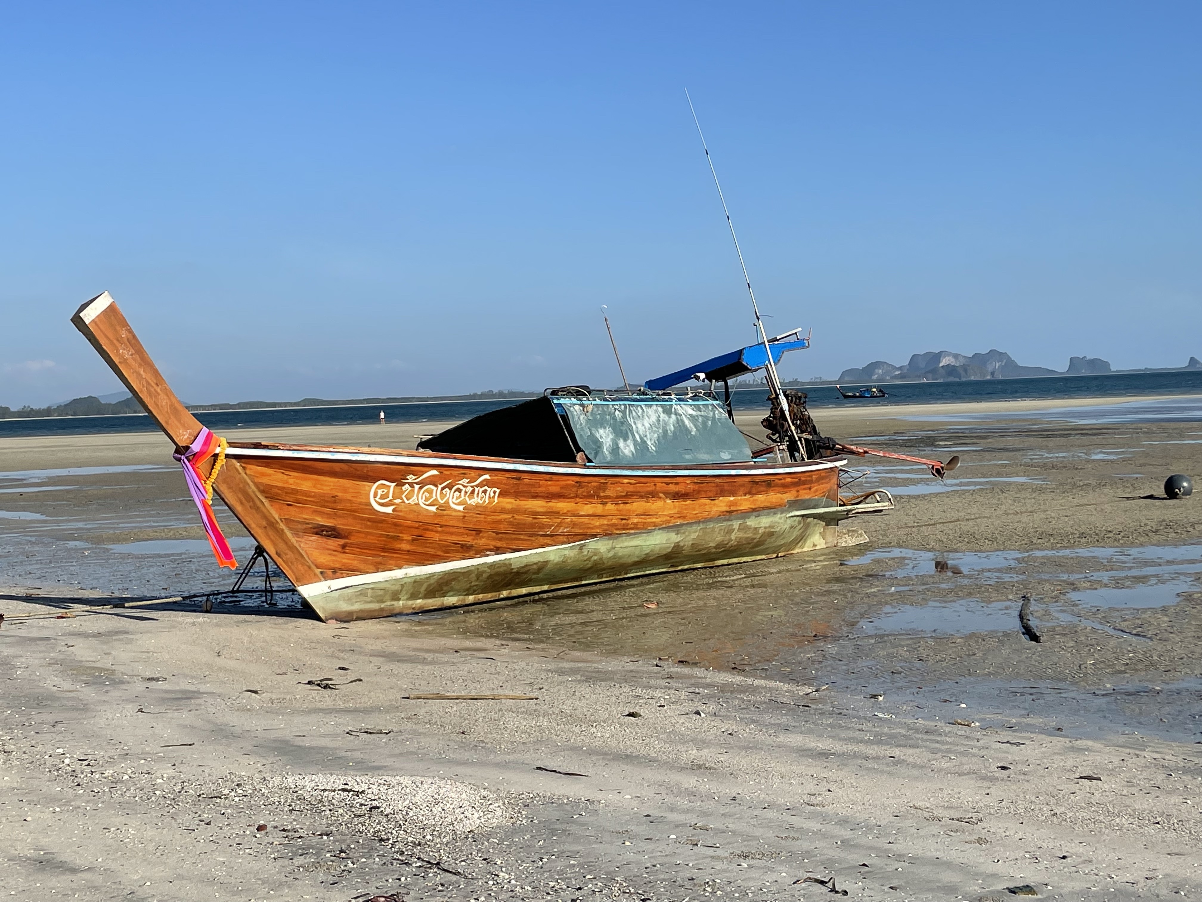The real name of the boat (and the canoe I saw at anchor this morning) is “ruea hang yao” (see pic). It is a hand-made wooden vessel with the shape of a canoe. The engine/outboard is attached to an inboard rotation device and the propeller is mounted onto the drive shaft which is a few meters long, protruding from the engine at the back of the boat. It is a clever design for cruising in shallow waters as you can control the exact height of the propeller.
