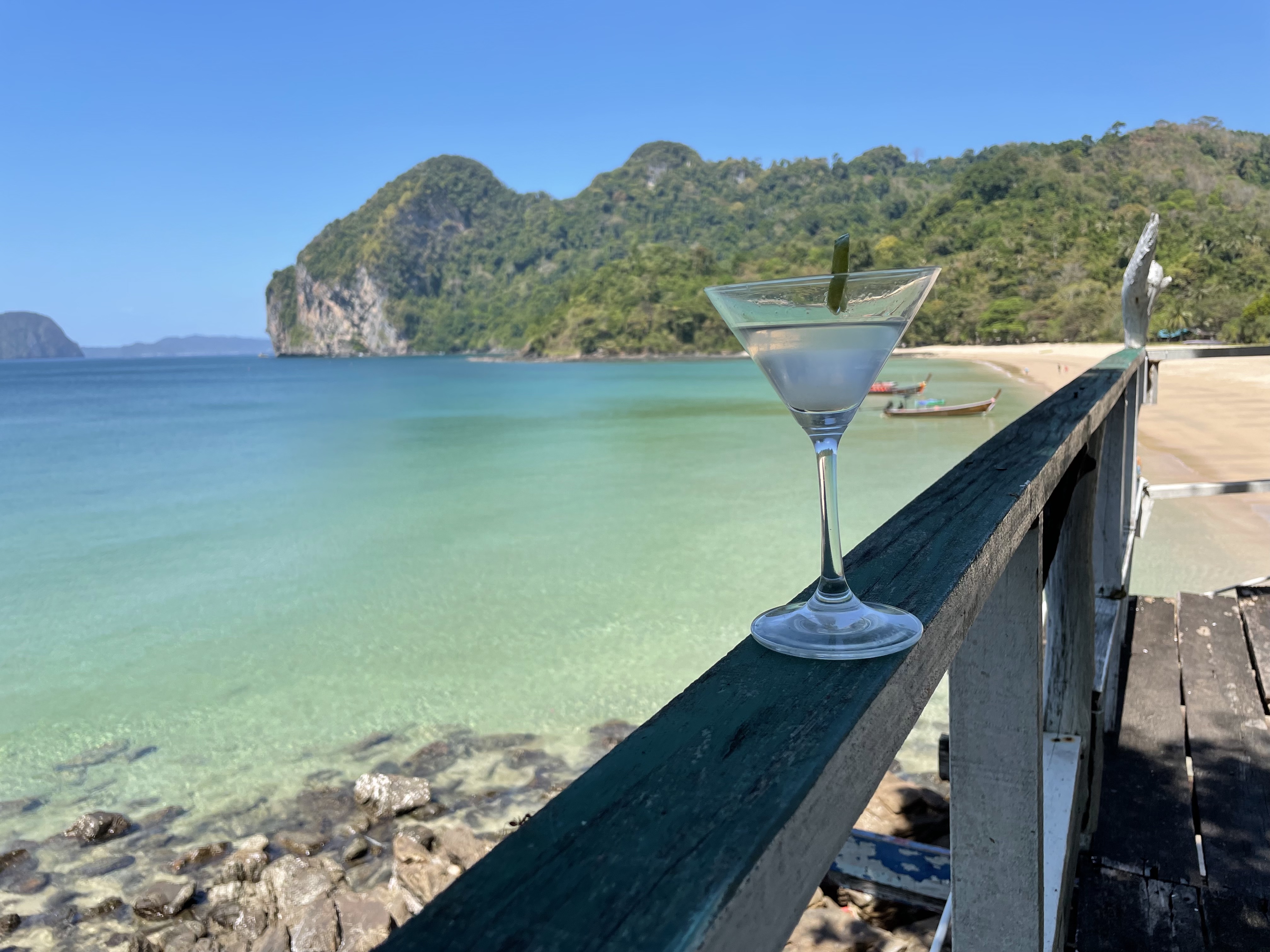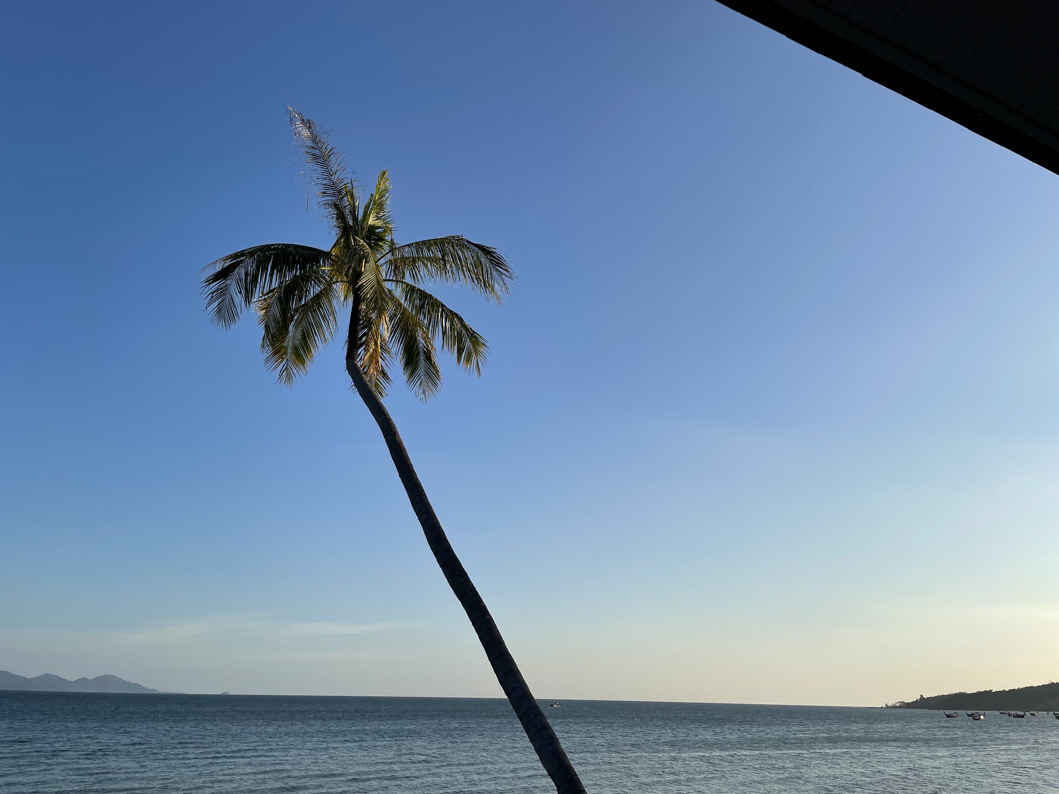 After breakfast this morning we walked to the west-side of the island. First you walk south along the beach then turn west and walk across the village. It is a poor village, the Thai government hasn’t built much infrastructure here and the businesses that cater to tourists have floundered under COVID. Except on the west-side. There is a lovely, post-card-material, beach called Sabai where we swam, lounged under the sun and read as privileged, undeserving, homo-sapiens that we are. I am half through Typhoon by J. Conrad. Very appropriate as it takes place around this part of the planet. There are two bars/huts perched on the hills and a restaurant built over a cliff where we had lunch. They didn’t have wine, but they had Gildbey’s gin (that is as low as I go) and tonic water (the last can of Shweppes in the island that I forgot to bring back to the hotel).