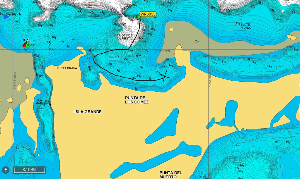 Anchoring was another matter. The Navionix charts I use in iNavX are not accurate and I wasn’t able to find  recent guides for the islands.   I had the Guía Naútica de Colombia which offers a few way points but it’s not up to date, and  some oldish blog telling you to find your way through the coral with good visibility because all buoys were gone.  The fact is that there are now green and red buoys that mark a channel of sorts, if you are able to figure out the start.  When we entered the anchorage we didn’t follow the right channel and almost run aground (we got it right when exiting).  One of the pics shows the place where we anchored and the channel.