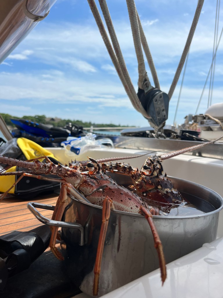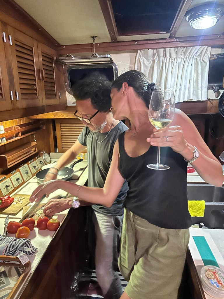 We spend our days swimming, reading, napping, cooking, eating, and enjoying cocktails and wine on the boat.  One afternoon a fisherman brought lobsters he had just plugged out of the water.  We bought two big ones that ended up in a salad.  Marina and Natalia felt some remorse and wanted to throw them back at sea but it was too late for the crustaceans.  It was their idea to buy them in the first place, yet I became the executioner. I used a knife.
