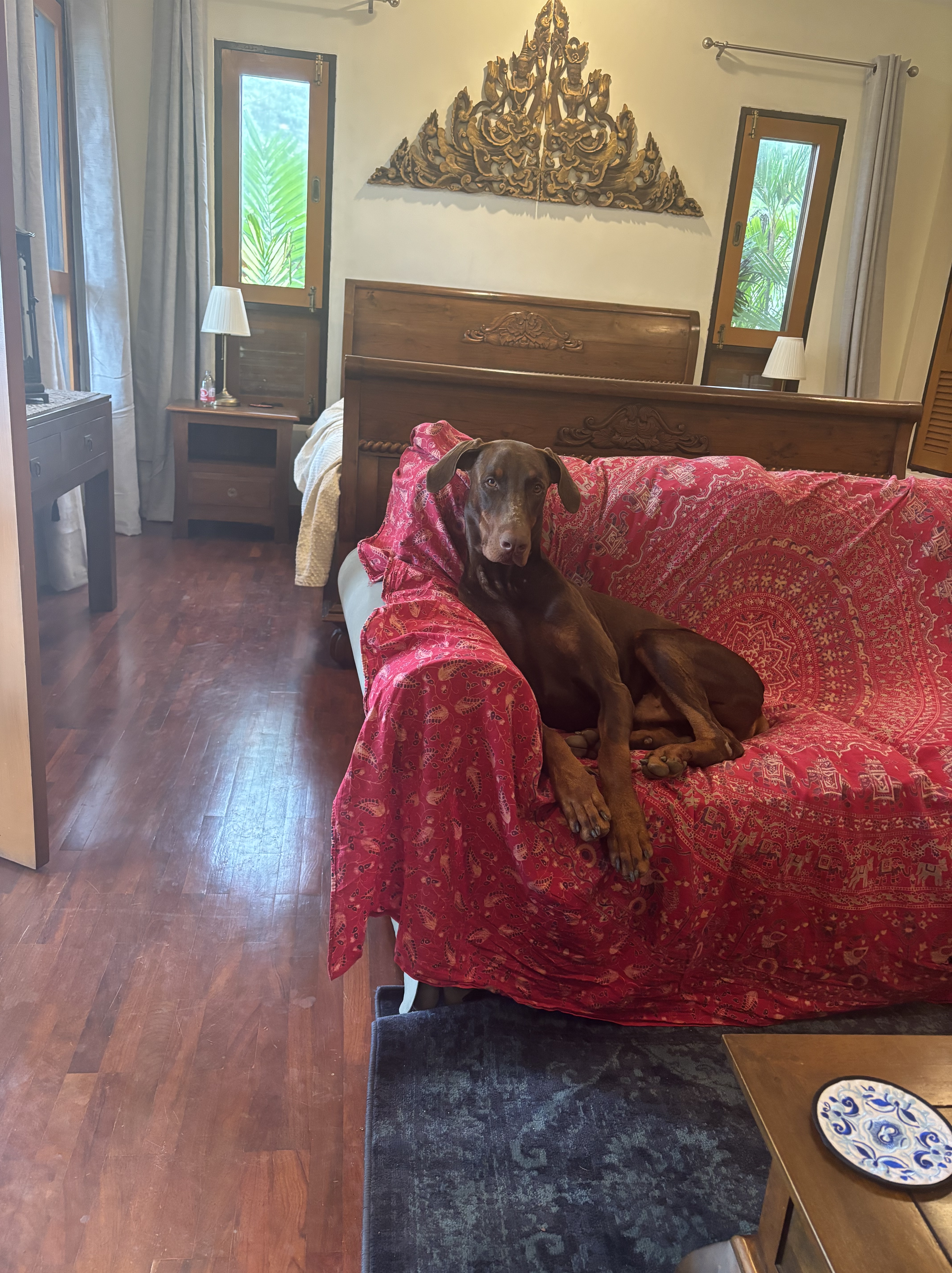 The original owners, who sold the house to our landlords, did a wonderful job remodeling and furnishing the place (the deco is a bit too “Thaish” but can live with it). It is surrounded by greenery; plants and trees which are part of the patio encircling the property, and others that belong to the forest that extends on the north side. Upon entering the house there is an open space with the dining room and the kitchen. To the right side, sliding doors open into a TV room which can also have the function of a living room. There are three bedrooms, two guest bedrooms to the left of the open space and the master bedroom next to the TV room. The TV/living room and the master bedrooms have large folding doors with glass that give access to an outside corridor surrounding the east and north sides of the house, and a baranda with views of the mountains and a fraction of the sea. It has become the place where we have drinks at the end of the day. The south side of the corridor also connects to a small swimming pool mainly used by Woland to cool down after a morning walk. I talk about “guest” rooms, but most of the time it will be either Natalia’s mother or my father, plus the girls. In fact, one bedroom will be Sofia’s in the near future. She is enrolled in an on-line school for 9th grade and will be coming to live with us in early November.