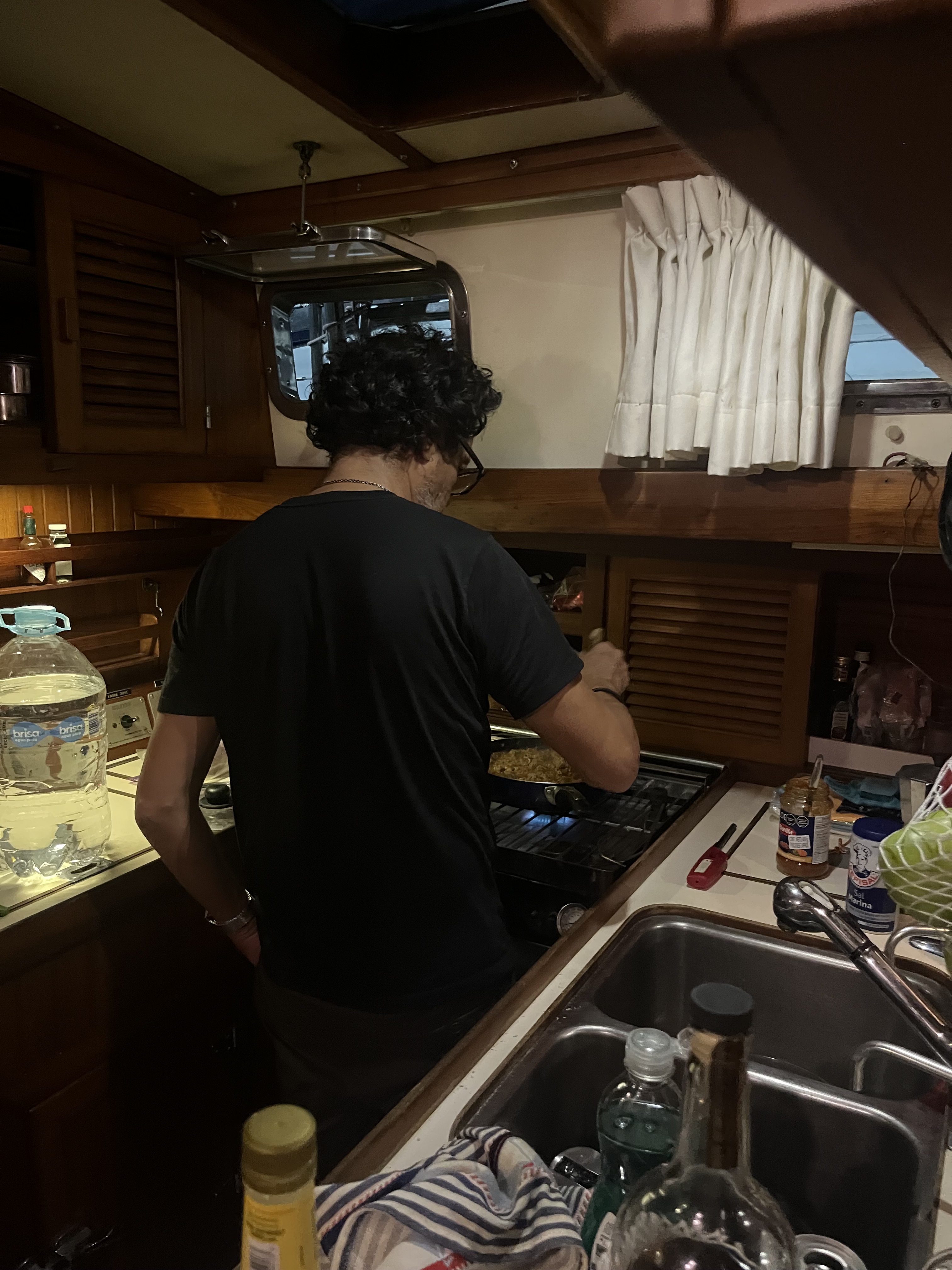 By early afternoon, it was clear we couldn’t rely on the autopilot and chart plotter overnight. We would hand-steer using the compass and my iPhone to check our position from time to time. Juan David and Marina were unfazed. Their appetites returned and had sandwiches and leftover Bolognese for lunch. For dinner I cooked some rice that we ate with tuna.