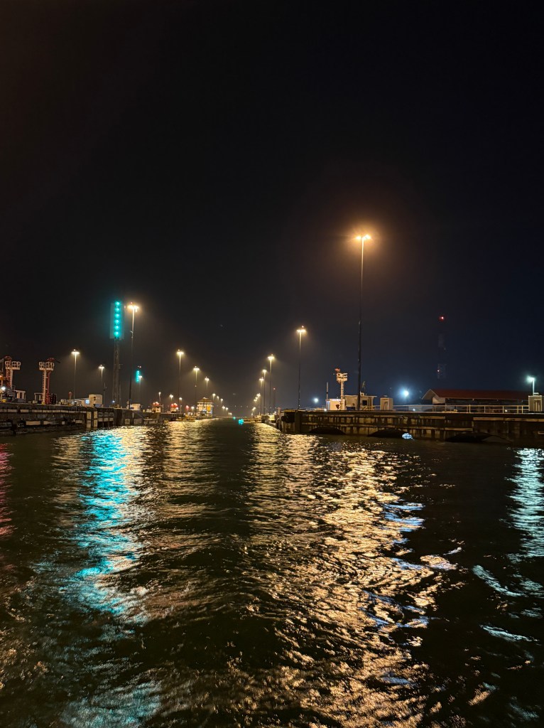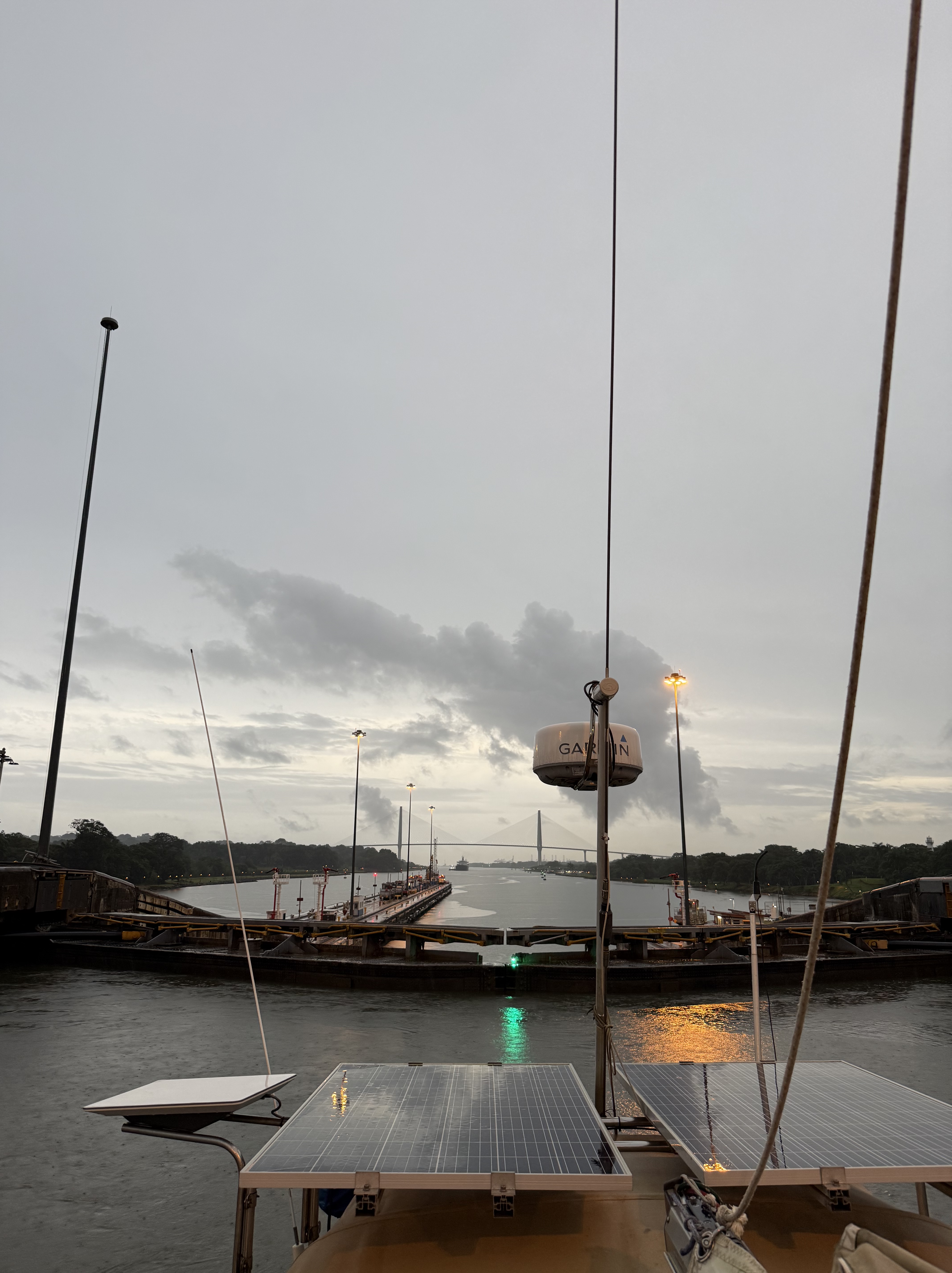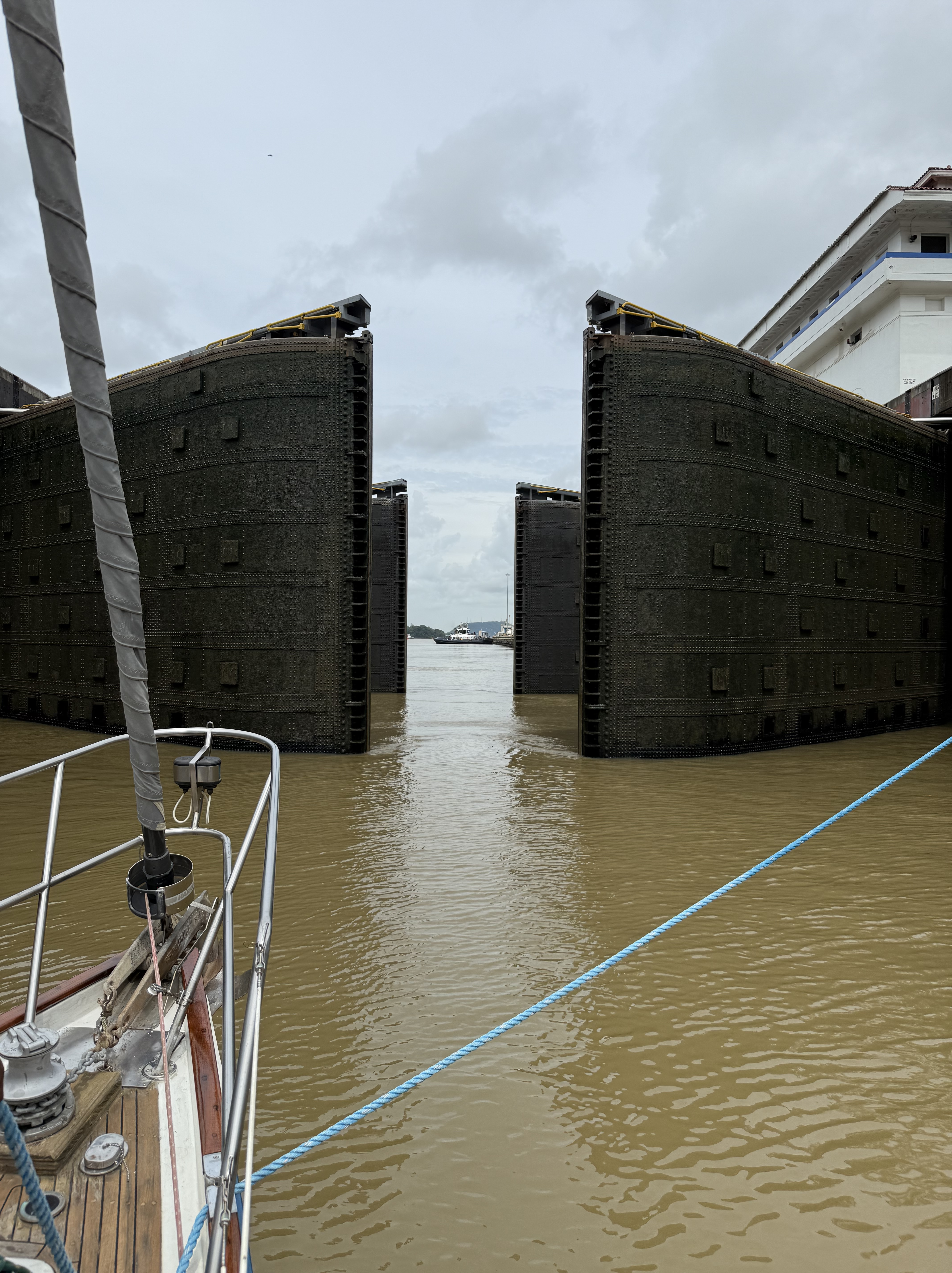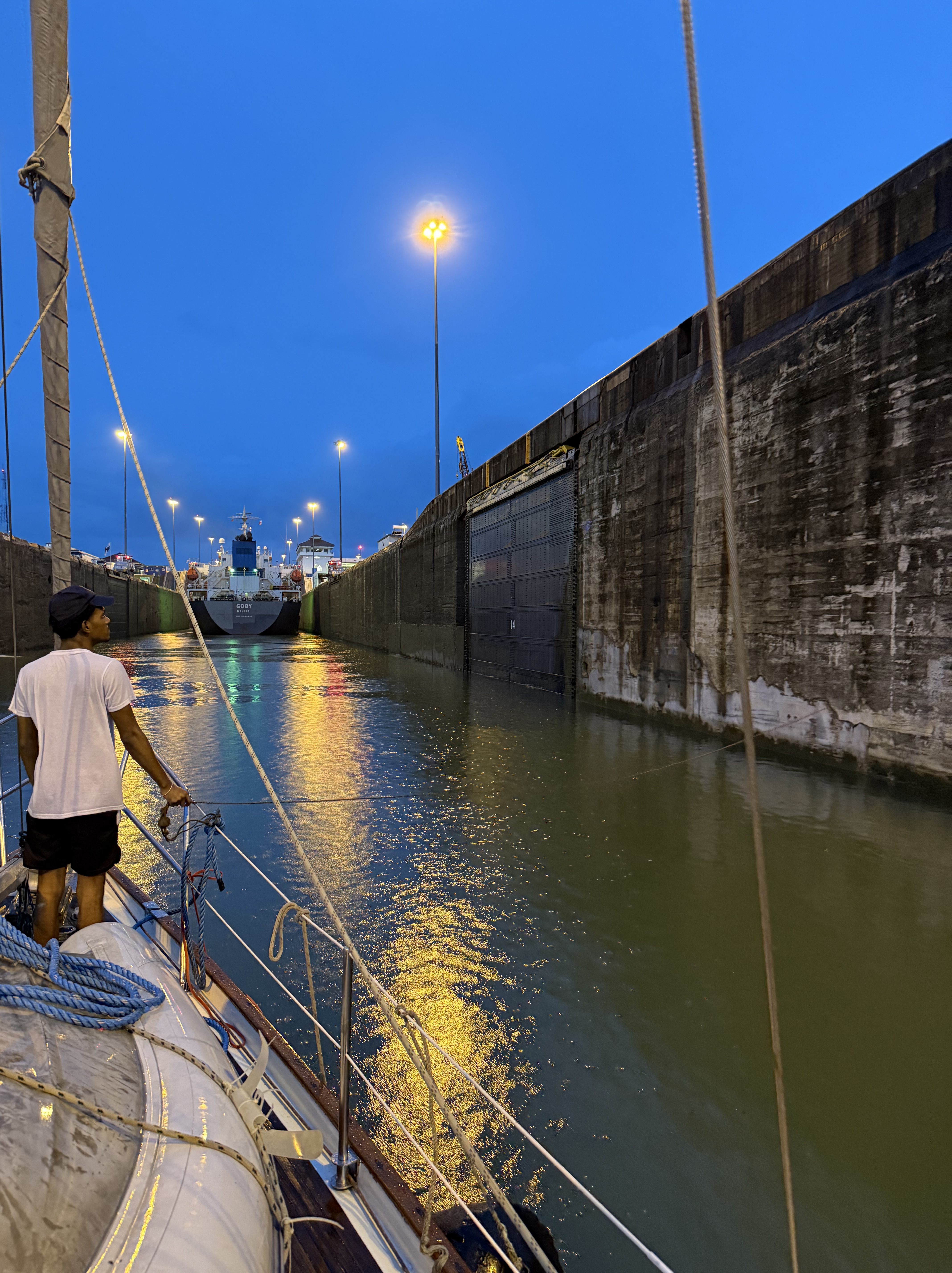 We started the crossing on Thursday afternoon, one day later than planned because BEHEMOTH wasn’t ready. The four line handlers came on board at 15:45, by 16:00 we were in the flat”, and the pilot/adviser boarded at 17:00. A nice guy, very competent, he showed me the boat we would be sharing the first set of locks with — a 300+ feet commercial vessel — and asked me to follow it while keeping the red buoys at a short distance on starboard. By 18:00 we were entering the first of the three locks in Gatún close to the wall on the starboard side for the line-handlers to receive the messenger lines that they made fast to the mooring lines, then crossed to the opposite wall to get the port messenger lines. The advisor told me whether to slow down the boat or move forward, and whether to adjust the helm to port or starboard. He guided us to the center of the chamber behind the commercial vessel, and the mooring lines were secured to the walls by canal’s line handlers. The lock started filling with considerable turbulence and we were lifted some 9 meters before the mooring lines were released — attached to the messenger lines — and we moved to the next lock. Not having to catch the messenger lines made the procedures easier in the next two locks. Still, one depends on the skills of the line handlers, including those working for the canal, to stop the boat and keeping her secure.