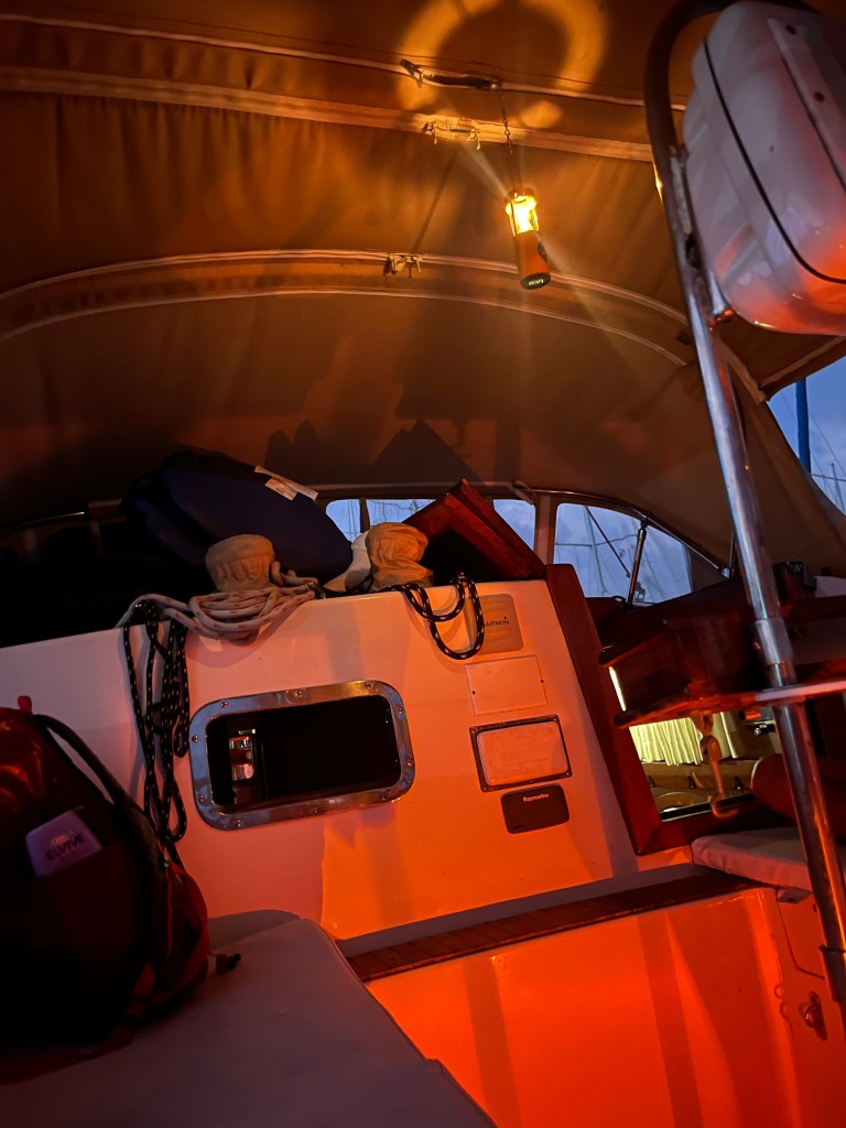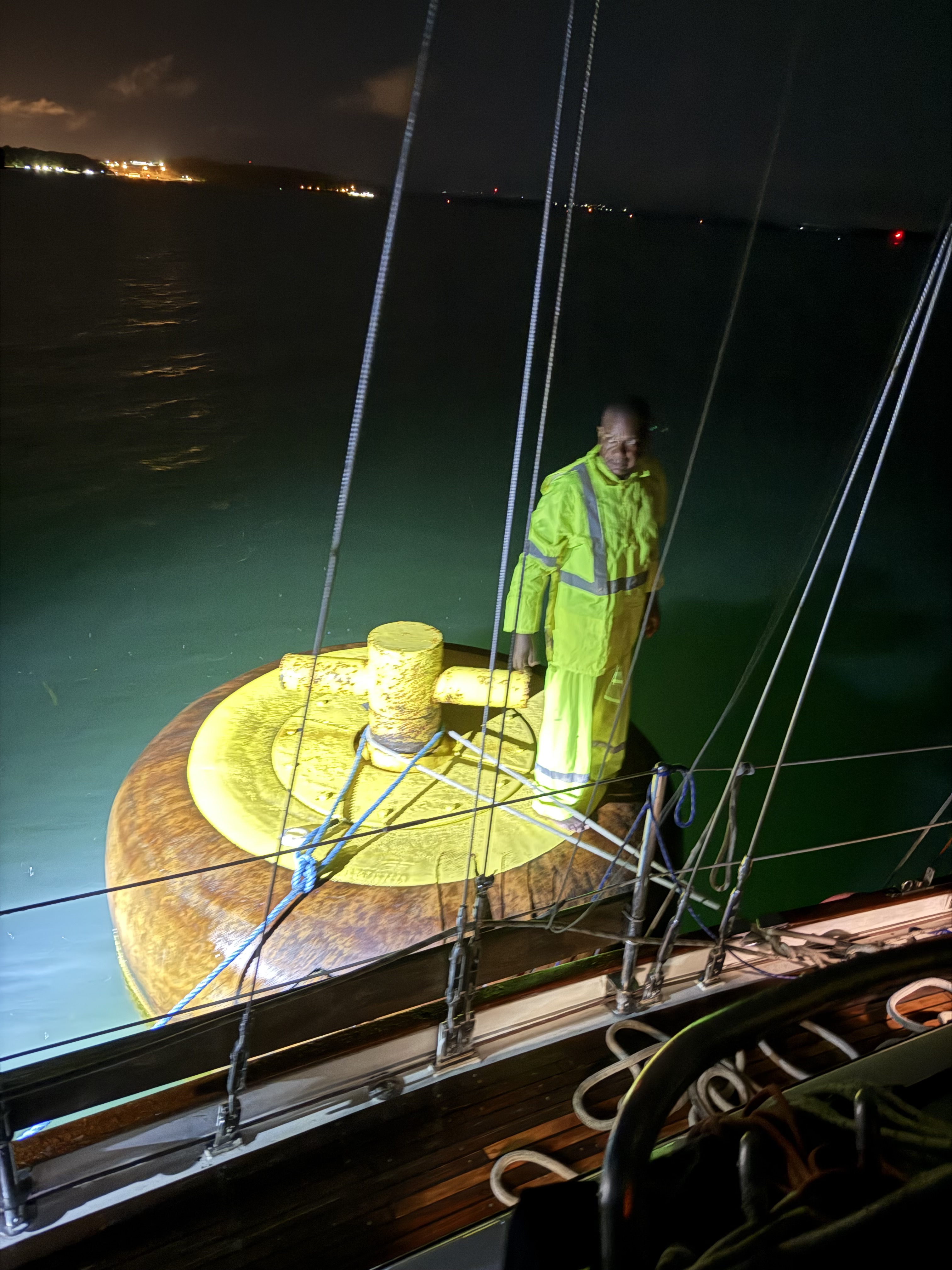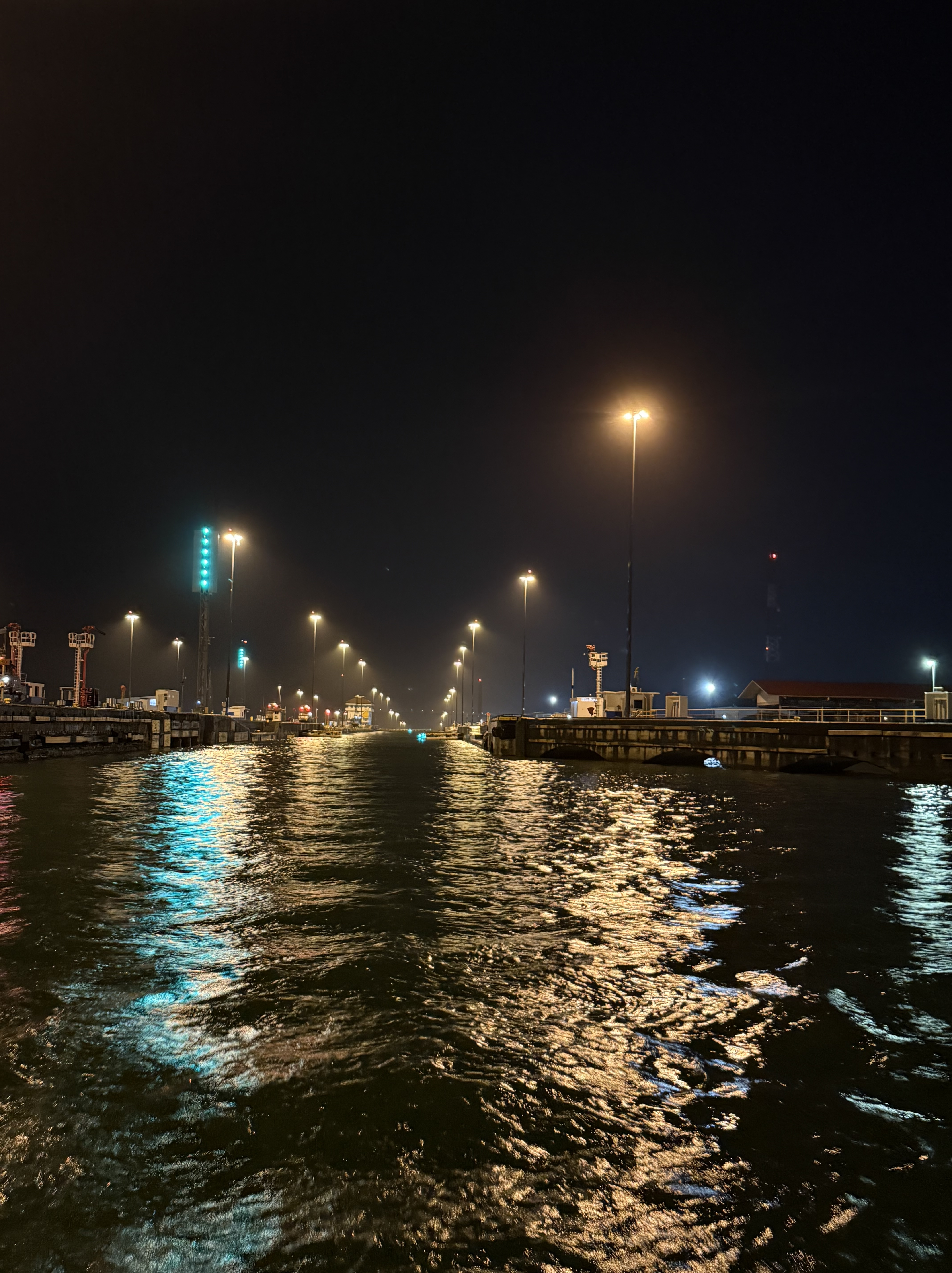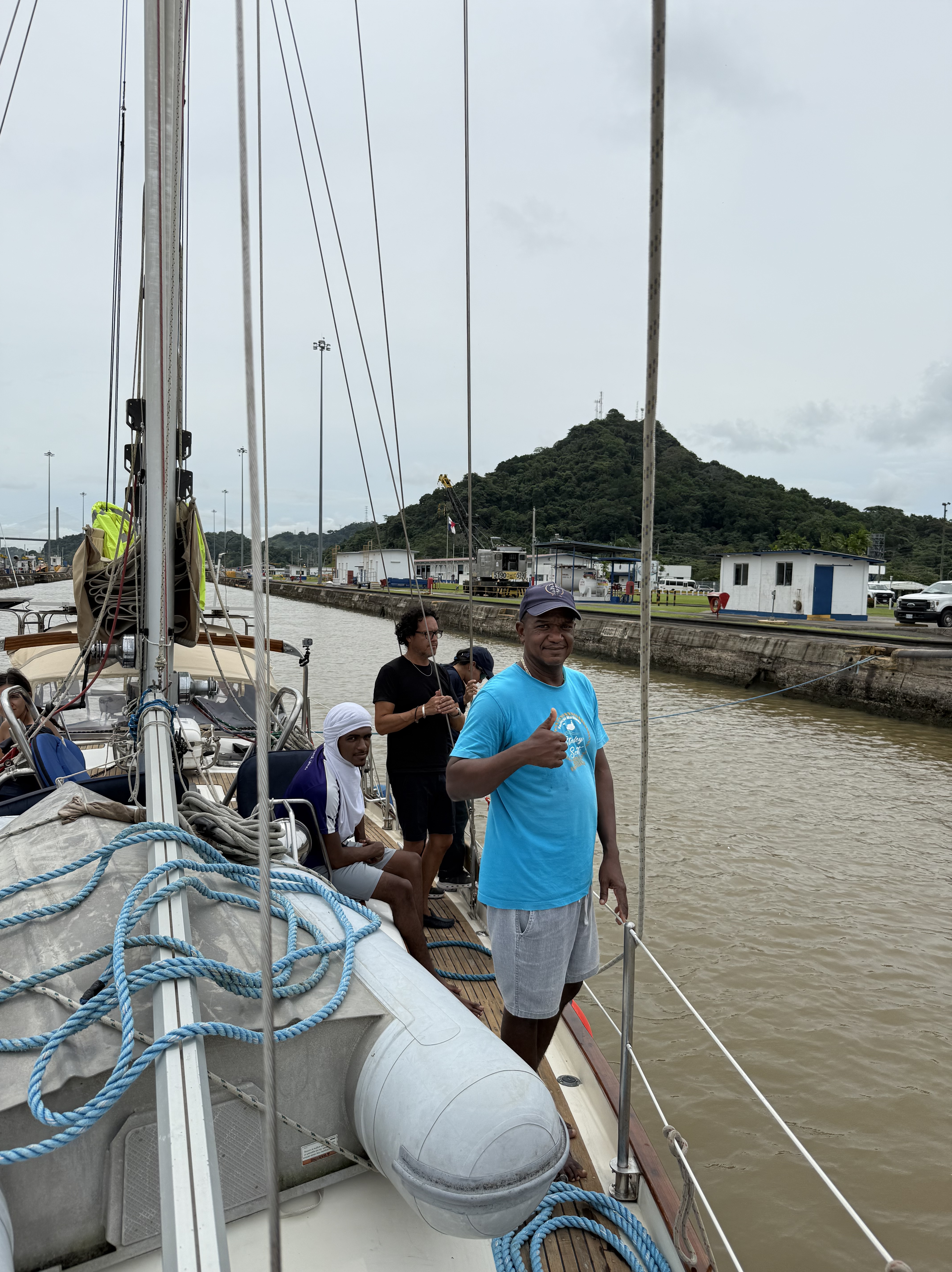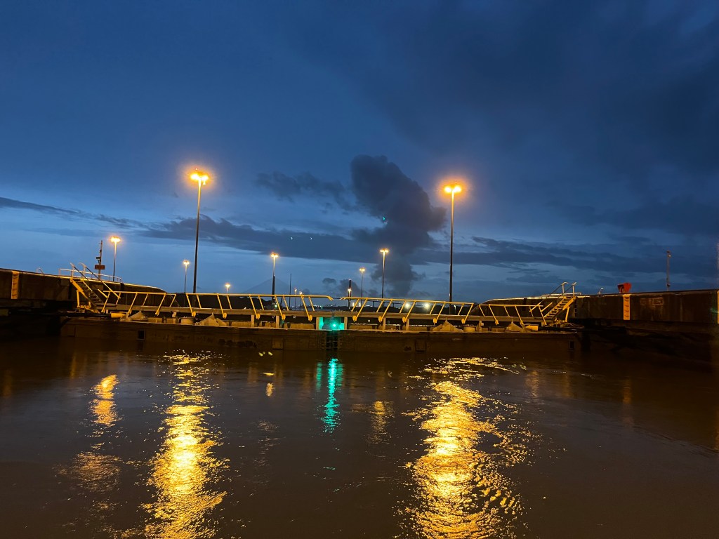 We started the crossing on Thursday afternoon, one day later than planned because BEHEMOTH wasn’t ready. The four line handlers came on board at 15:45, by 16:00 we were in the flat”, and the pilot/adviser boarded at 17:00. A nice guy, very competent, he showed me the boat we would be sharing the first set of locks with — a 300+ feet commercial vessel — and asked me to follow it while keeping the red buoys at a short distance on starboard. By 18:00 we were entering the first of the three locks in Gatún close to the wall on the starboard side for the line-handlers to receive the messenger lines that they made fast to the mooring lines, then crossed to the opposite wall to get the port messenger lines. The advisor told me whether to slow down the boat or move forward, and whether to adjust the helm to port or starboard. He guided us to the center of the chamber behind the commercial vessel, and the mooring lines were secured to the walls by canal’s line handlers. The lock started filling with considerable turbulence and we were lifted some 9 meters before the mooring lines were released — attached to the messenger lines — and we moved to the next lock. Not having to catch the messenger lines made the procedures easier in the next two locks. Still, one depends on the skills of the line handlers, including those working for the canal, to stop the boat and keeping her secure.