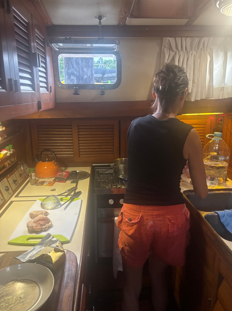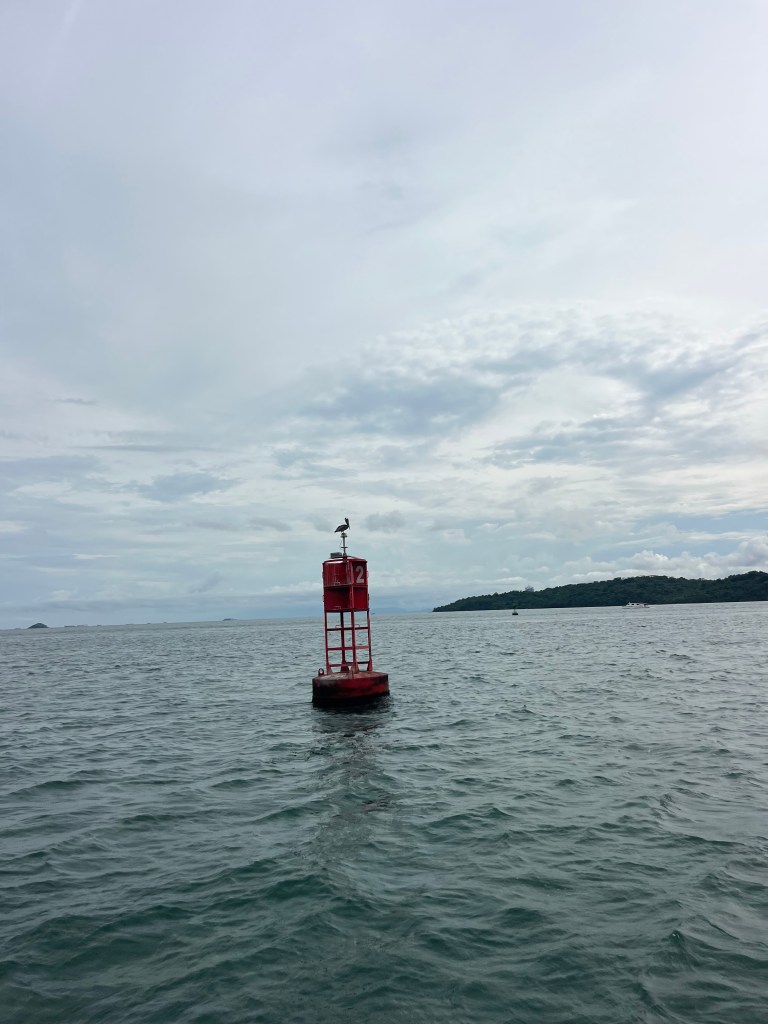 It took us some 4.5 hours to reach the San Miguel lock. Before Gamboa the surroundings of the canal are beautiful, a green forest cut by affluents of the main river some going back to the Atlantic. There are a couple of resorts where locals and tourists stay. They rent small speed boats to explore the surrounding and discover the flora and fauna. There was not much traffic that day, just a few commercial boats transiting in both directions. The line handlers were sleeping on the deck, Natalia and Marina reading, the advisor taking pictures, and BEHEMOTH on auto-pilot when I saw we were about to hit a red buoy. I rushed to the wheel, set the autopilot to stand-by, and made a sharp turn to port while shouting “cuidado!” We barely missed the buoy. Just a few days before, the agent I hired told me to be careful because people get complacent (there is an advisor after all), nobody is really on watch, and then the boats hit a buoy or run aground.